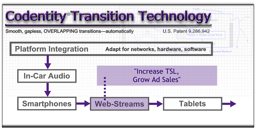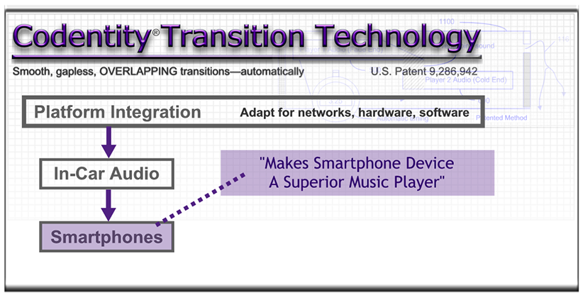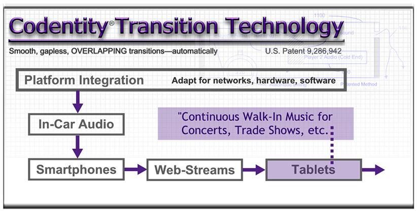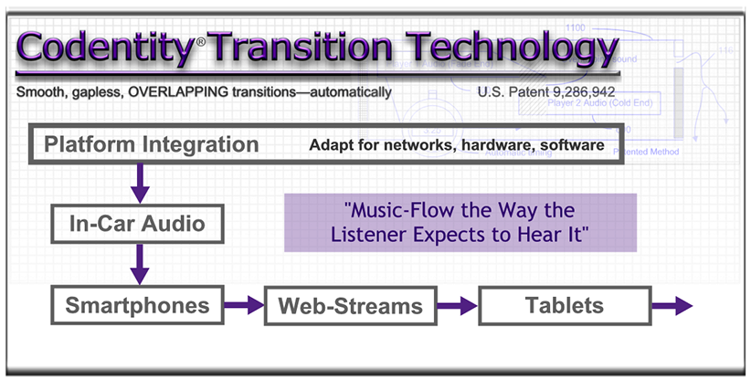 For a fee, patented (U.S. 9,286,942) Codentity Transition Technology (CTT) can be licensed and adapted to improve the music-flow experience across a diverse set of digital presentation platforms—smartphone, Web streams, tablets, and more.