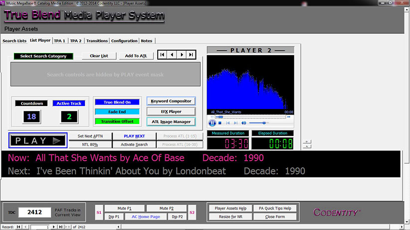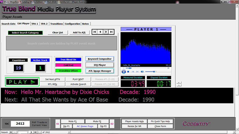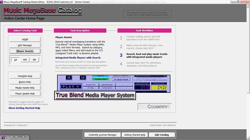 IMPORTANT: Codentity has tested the Music MegaBase™ Catalog (MMBC) Media Edition with its True Blend™ Media Player System (MPS) on various Windows® XP, Windows® 7, Windows® 8 / 8.1, and Windows® 10 computers. For best performance, Codentity recommends operating the MMBC and True Blend™ MPS using the Codentity-supplied Microsoft® Access™ XP (2002) RUNTIME files under Windows® XP / 7 / 8 / 8.1 / 10. Codentity is licensed to supply FREE Access™ XP (2002) RUNTIME files—without charge to valid licensed users.