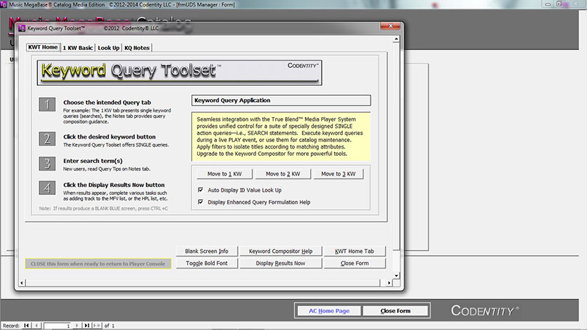 For best performance under Windows® XP, Windows® 7, Windows® 8 /8.1, or Windows® 10, Codentity recommends installing the 32-bit Access™ 2002 (XP) RUNTIME files which Codentity provides at no extra cost to licensed users of Music MegaBase™ Catalog Media Edition (which includes the True Blend™ MPS)