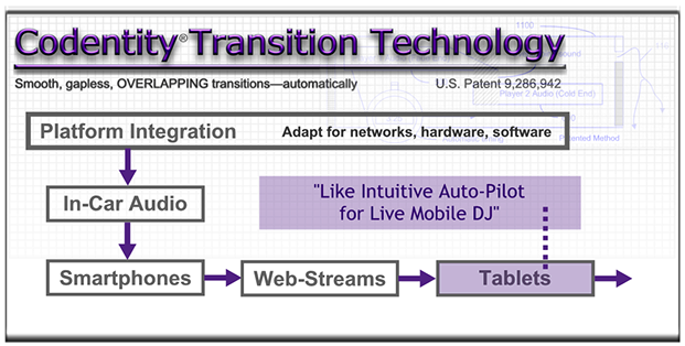 For a fee, patented (U.S. 9,286,942) Codentity Transition Technology (CTT) can be licensed and adapted to improve the music-flow experience across a diverse set of digital presentation platforms—smartphone, Web streams, tablets, and more.