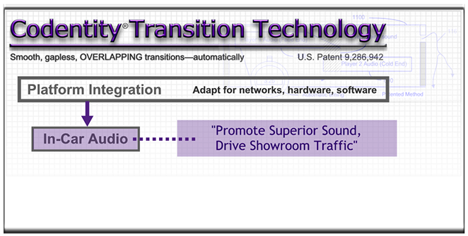 Applications running on a range of platform devices can greatly benefit by licensing and adapting Codentity Transition Technology (CTT). Patented CTT (U.S. 9,286,942) can AUTOMATICALLY eliminate annoying between-song SILENCE GAPS.