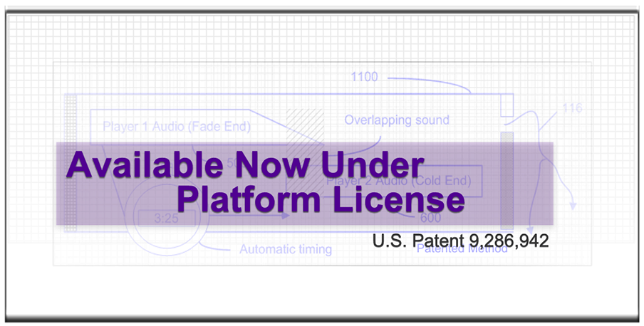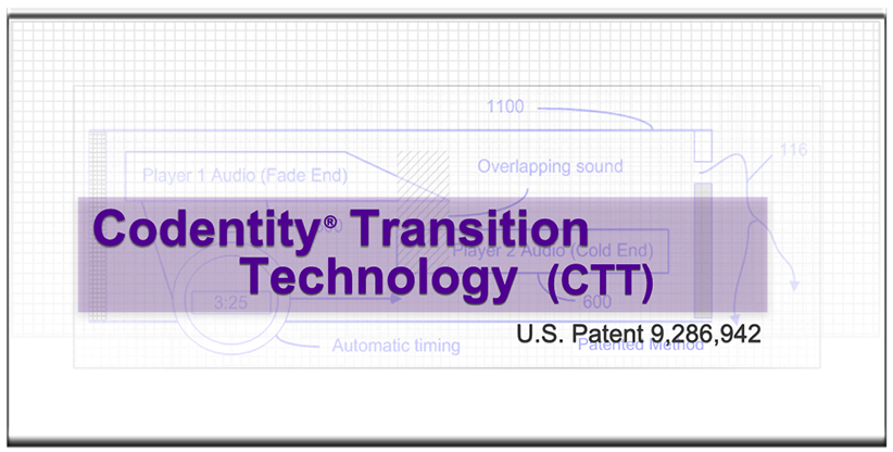 Patented Codentity® Transition Technology (U.S. 9,286,942) overcomes the challenges of optimum track duration calculation and audio level presentation—automatically. This produces naturally-synchronized song-to-song transitions. And, unlike other products, Codentity® Transition Technology (CTT) does not require assigned song durations, file editing, or fade point encoding.