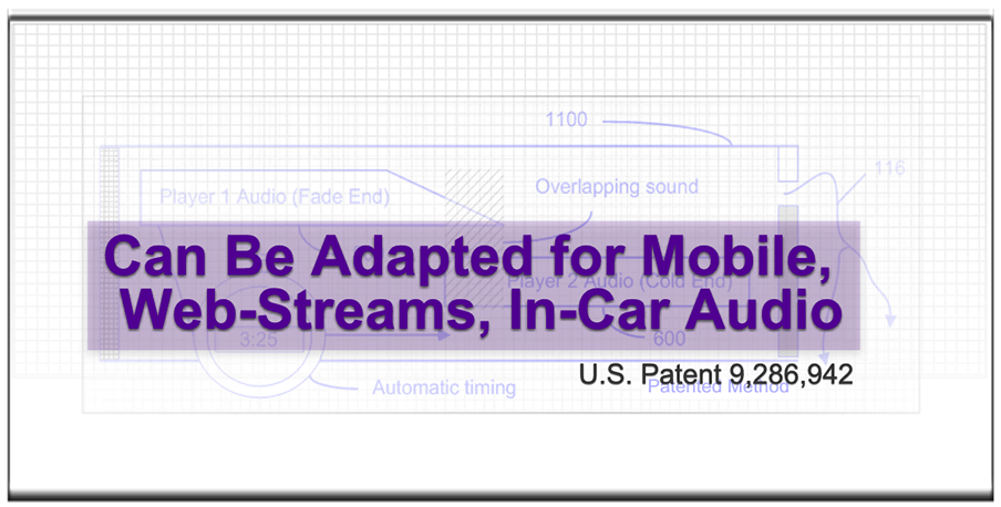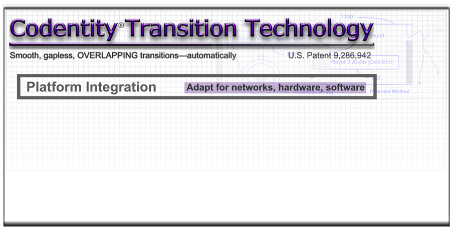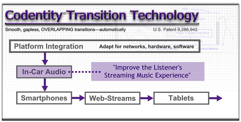 For a fee, patented (U.S. 9,286,942) Codentity Transition Technology (CTT) can be licensed and adapted to improve the music-flow experience across a diverse set of digital presentation platforms—smartphone, Web streams, tablets, and more.