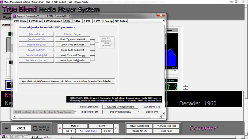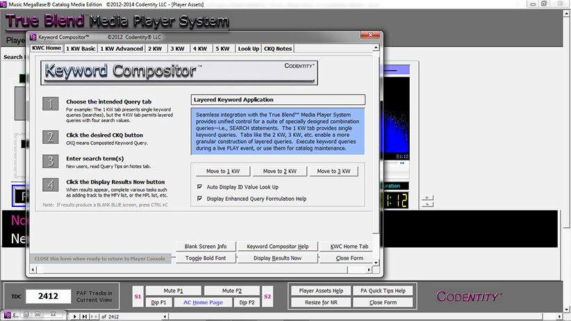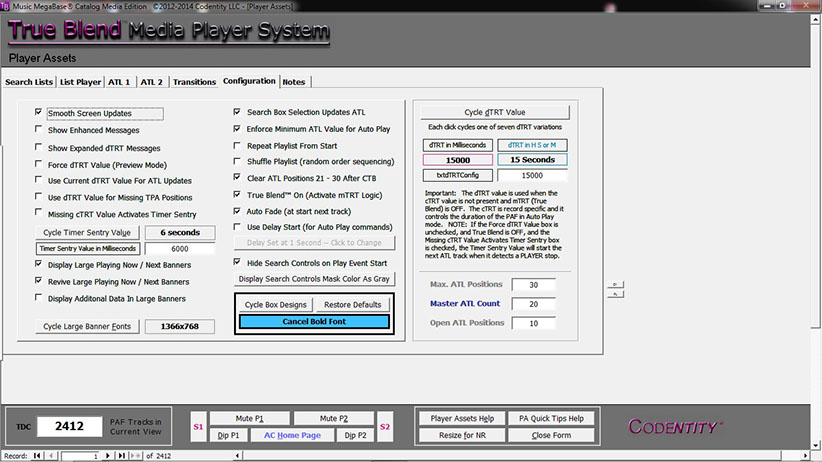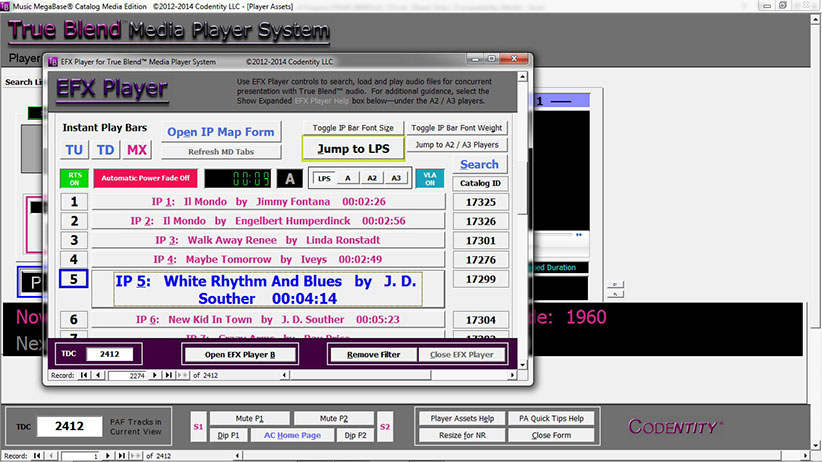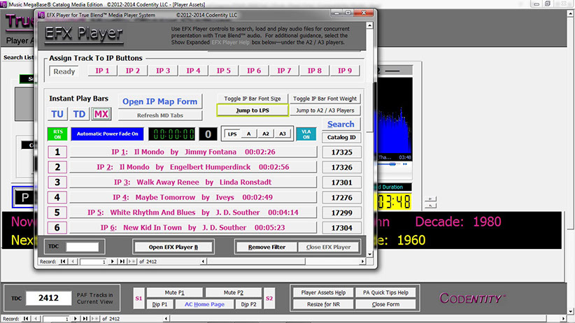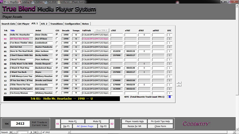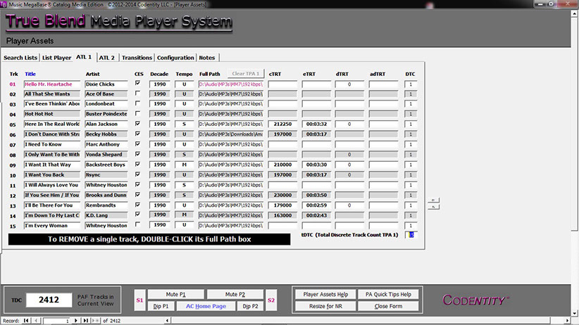 IMPORTANT: Codentity has tested the Music MegaBase™ Catalog (MMBC) Media Edition with its True Blend™ Media Player System (MPS) on various Windows® XP, Windows® 7, Windows® 8 / 8.1, and Windows® 10 computers. For best performance, Codentity recommends operating the MMBC and True Blend™ MPS using the Codentity-supplied Microsoft® Access™ XP (2002) RUNTIME files under Windows® XP / 7 / 8 / 8.1 / 10. Codentity is licensed to supply FREE Access™ XP (2002) RUNTIME files—without charge to valid licensed users.