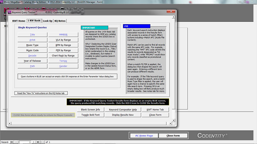 For best performance under Windows® XP, Windows® 7, Windows® 8 /8.1, or Windows® 10, Codentity recommends installing the 32-bit Access™ 2002 (XP) RUNTIME files which Codentity provides at no extra cost to licensed users of Music MegaBase™ Catalog Media Edition (which includes the True Blend™ MPS)