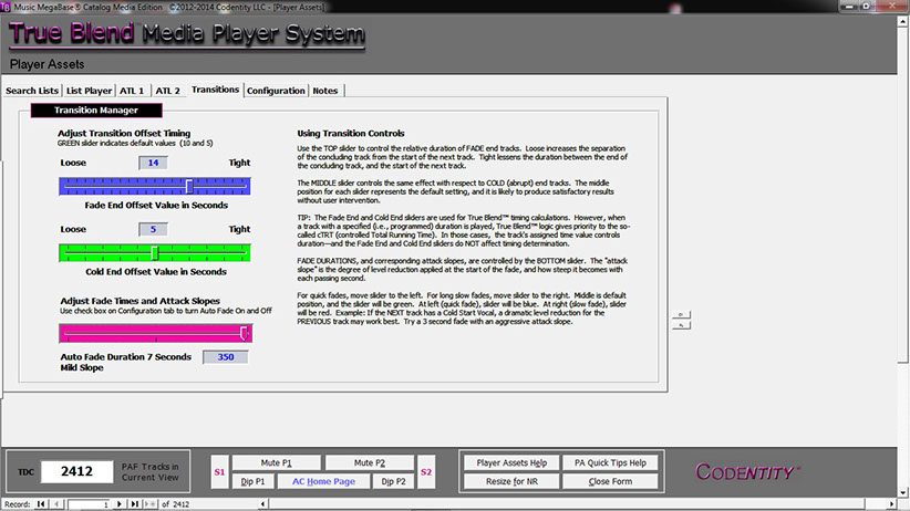 The True Blend™ Media Player System (MPS) is only licensed as part of the Music MegaBase™ Catalog (MMBC) Media Edition. MPS and MMBC are powered by Microsoft® Access™ and a "runtime" version of Access™ is included with the software distribution package.