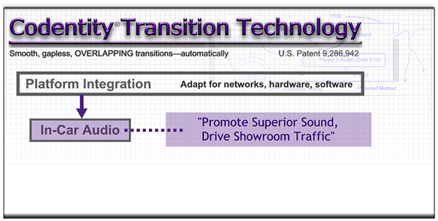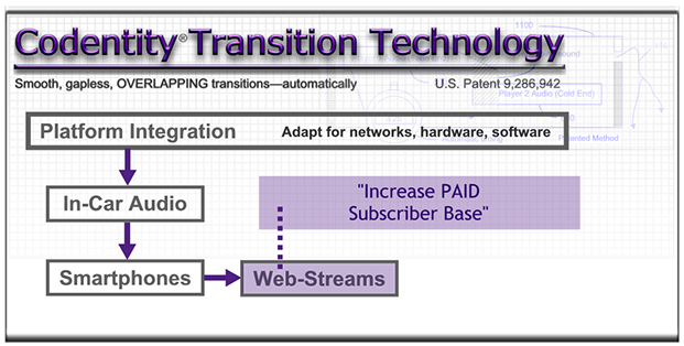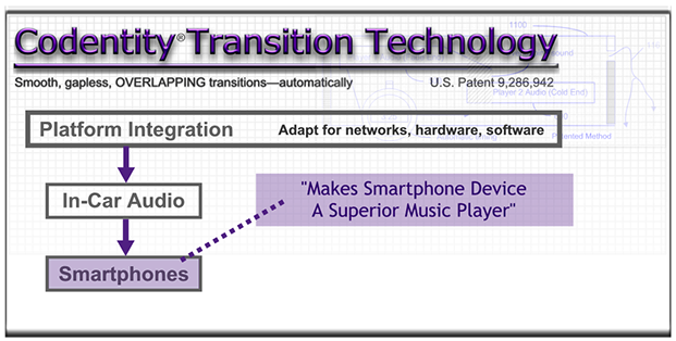For a fee, patented (U.S. 9,286,942) Codentity Transition Technology (CTT) can be licensed and adapted to improve the music-flow experience across a diverse set of digital presentation platforms—smartphone, Web streams, tablets, and more.